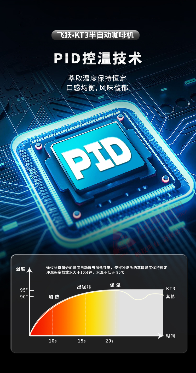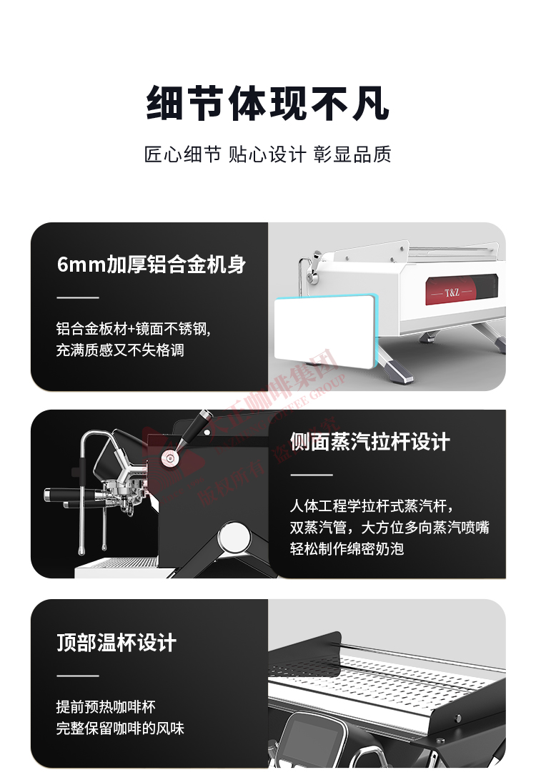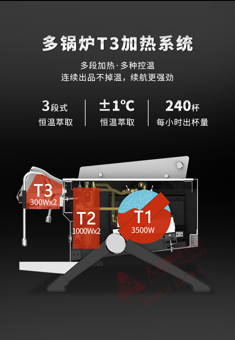 ①  T3加热系统,12L大容量蒸汽锅炉,可保障连续出品不掉温,强劲续航邀力