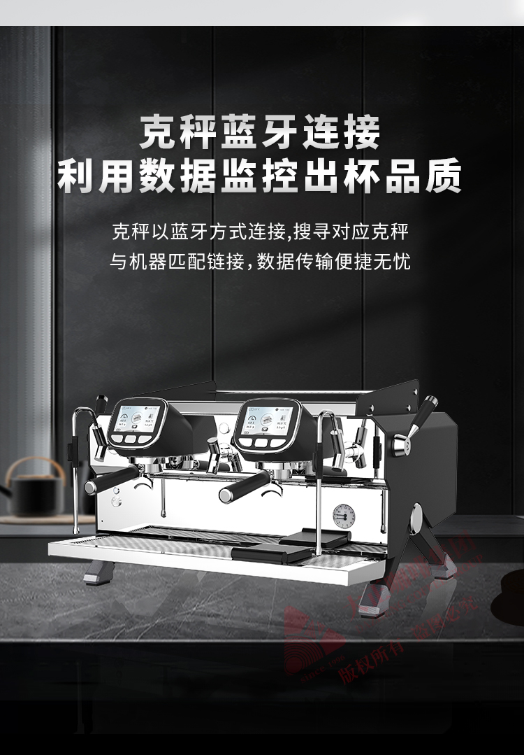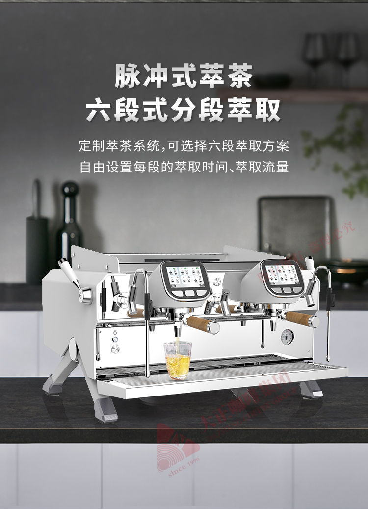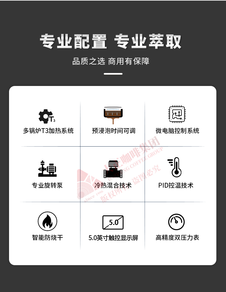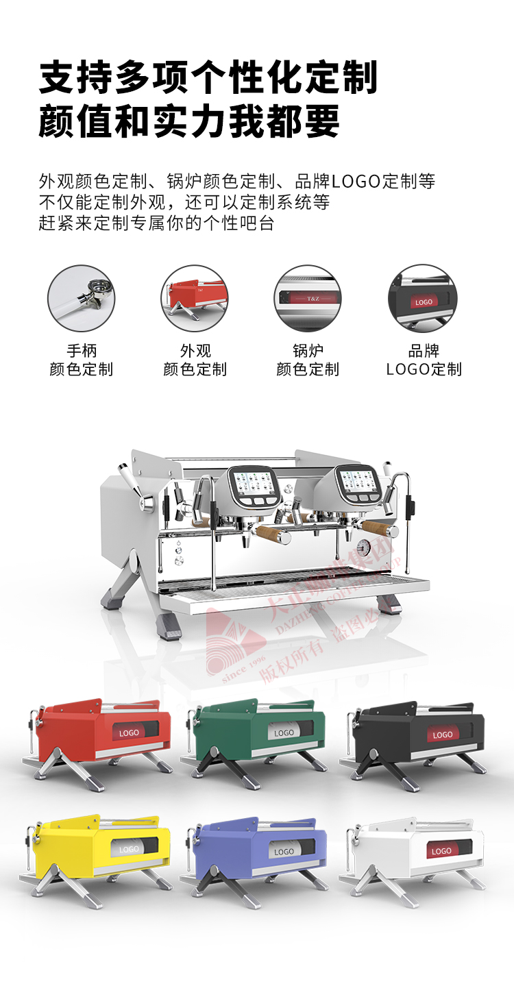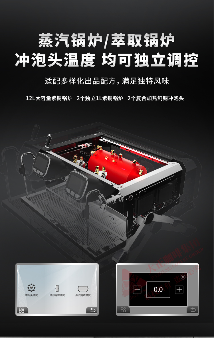 产品描述: ① T3加热系统,12L大容量蒸汽锅炉,可保障连续出品不掉温,强劲续航邀力 ② 5.0英寸双触控屏,支持设置参数以及萃取时显示萃取参数 ③ 接水盘网状设计,有效减少溅水现象 ④ 侧面蒸汽拉杆设计,操作更便捷 ⑤ 除蒸汽锅炉外,双区温度设置,两边开水锅炉/冲泡头可单独设定不同温度,适配不同出品配方/原料 ⑥ 高精度一表显,气压、水压双监测,有效保障在稳定压力下专业基取 ⑦ 配置冷热水混合阀,出水不喷溅 ⑧ 商用专业旋转泵,有效保障水压稳定,提升稳定萃取能力 ⑨ 可做定制化,包含机器颜色,背后logo图案 ⑩ 背后透光logo设计