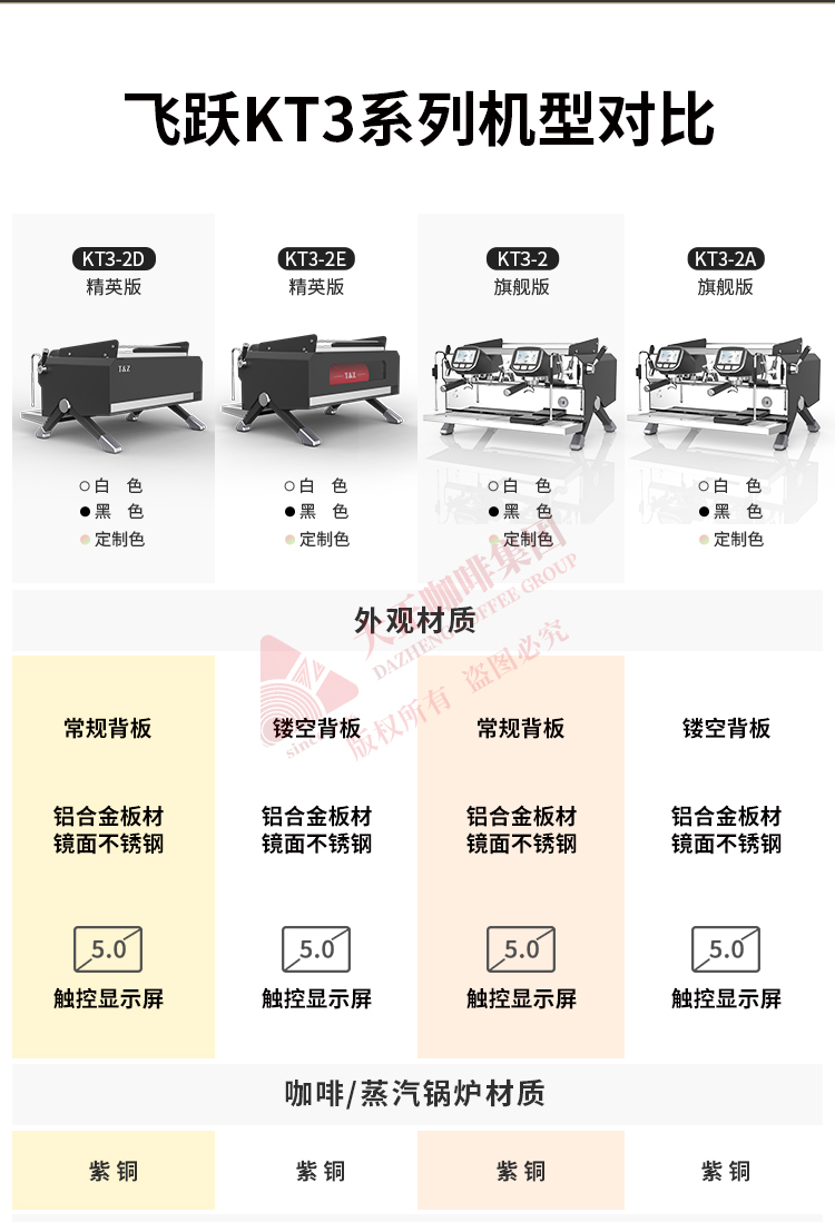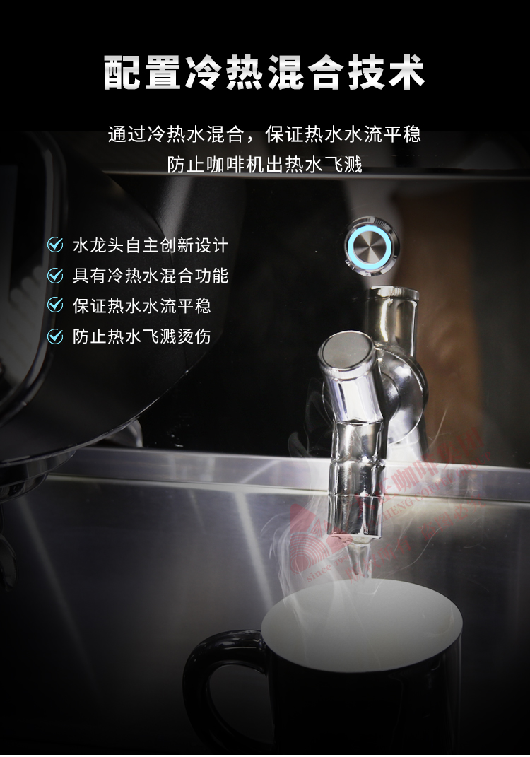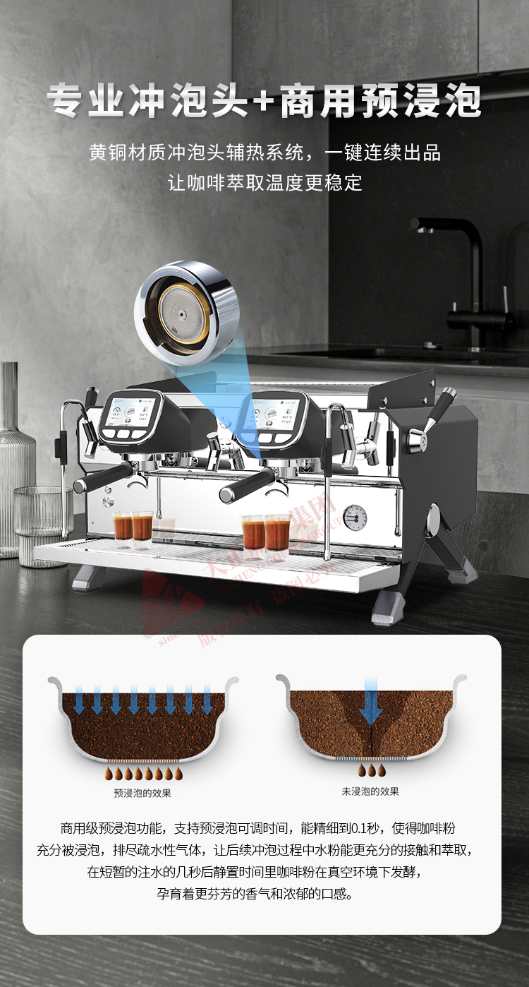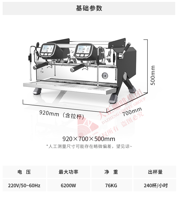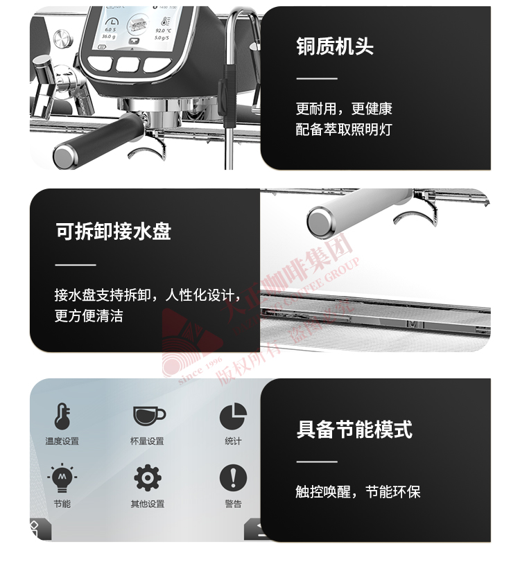 产品描述: ① T3加热系统,12L大容量蒸汽锅炉,可保障连续出品不掉温,强劲续航邀力 ② 5.0英寸双触控屏,支持设置参数以及萃取时显示萃取参数 ③ 接水盘网状设计,有效减少溅水现象 ④ 侧面蒸汽拉杆设计,操作更便捷 ⑤ 除蒸汽锅炉外,双区温度设置,两边开水锅炉/冲泡头可单独设定不同温度,适配不同出品配方/原料 ⑥ 高精度一表显,气压、水压双监测,有效保障在稳定压力下专业基取 ⑦ 配置冷热水混合阀,出水不喷溅 ⑧ 商用专业旋转泵,有效保障水压稳定,提升稳定萃取能力 ⑨ 可做定制化,包含机器颜色,背后logo图案 ⑩ 背后透光logo设计